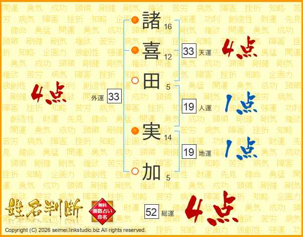 諸(16画)喜(12画)田(5画) 実(14画)加(5画)