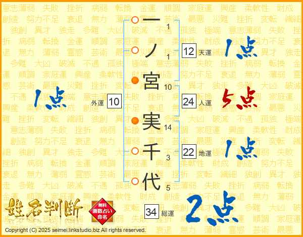一(1画)ノ(1画)宮(10画) 実(14画)千(3画)代(5画)