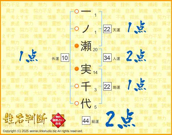 一(1画)ノ(1画)瀬(20画) 実(14画)千(3画)代(5画)