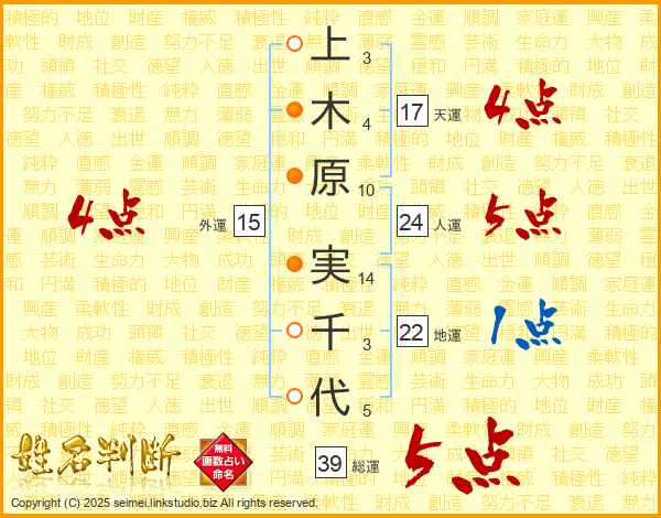 上(3画)木(4画)原(10画) 実(14画)千(3画)代(5画)