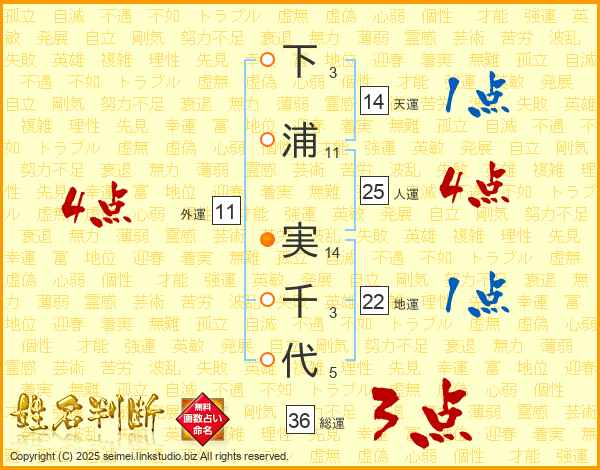 下(3画)浦(11画) 実(14画)千(3画)代(5画)