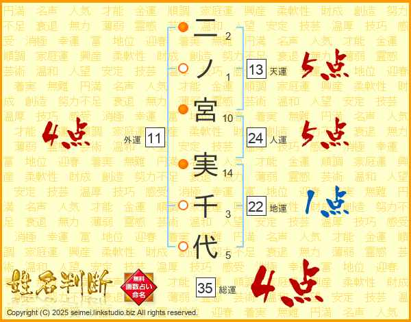 二(2画)ノ(1画)宮(10画) 実(14画)千(3画)代(5画)
