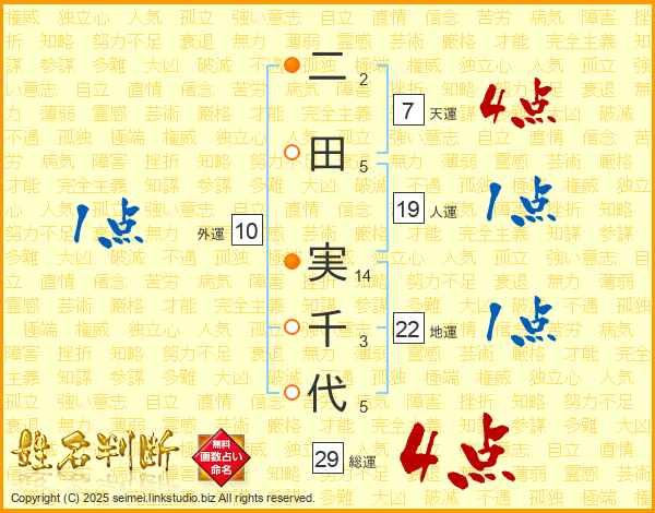 生活面を象徴する運勢です。外部から受ける影響力を表し、結婚運、家庭運や職場、環境への順応性を表します。総運から人運を引いた画数。姓や名が1文字の場合を除く。