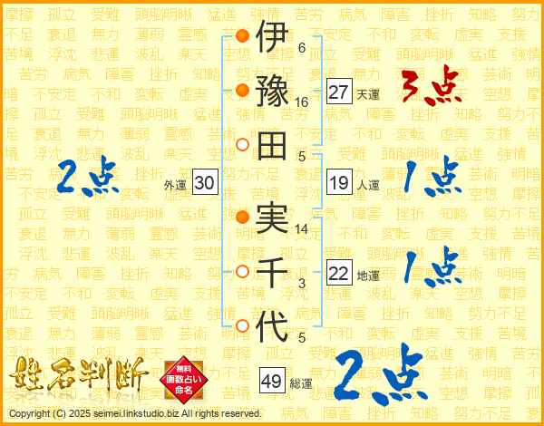 伊(6画)豫(16画)田(5画) 実(14画)千(3画)代(5画)