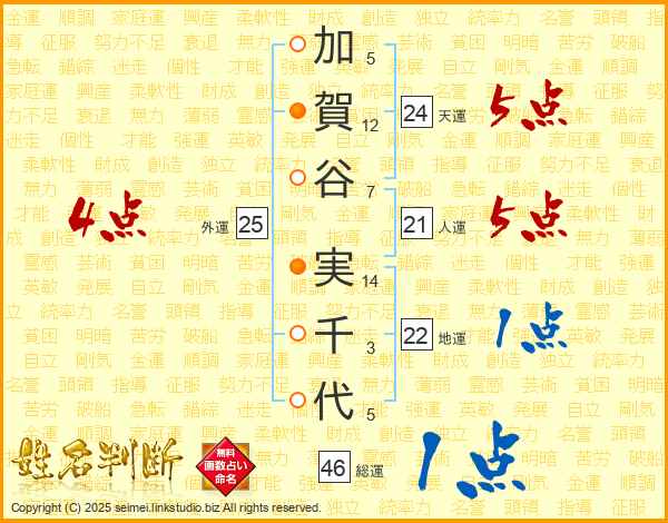 加賀谷実千代さんの総運は46画の1点!