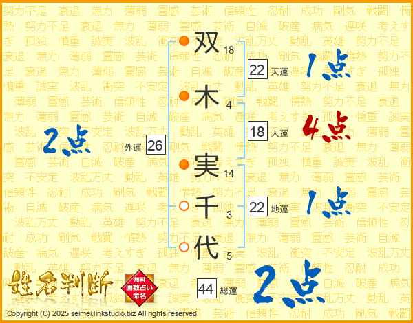 双(18画)木(4画) 実(14画)千(3画)代(5画)