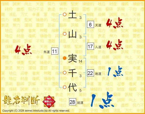 土(3画)山(3画) 実(14画)千(3画)代(5画)