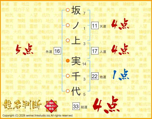 坂(7画)ノ(1画)上(3画) 実(14画)千(3画)代(5画)
