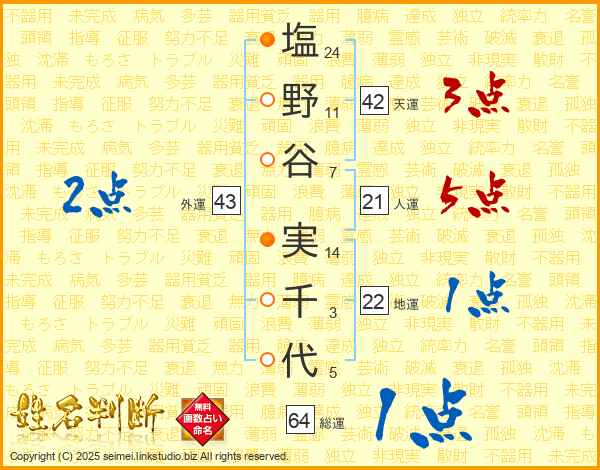 塩野谷実千代さんの人運は21画の5点!
