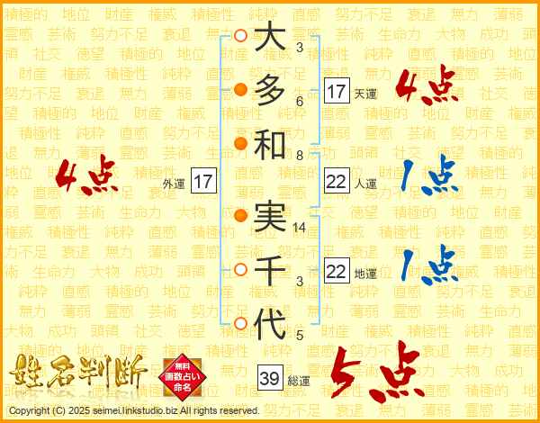 大(3画)多(6画)和(8画) 実(14画)千(3画)代(5画)