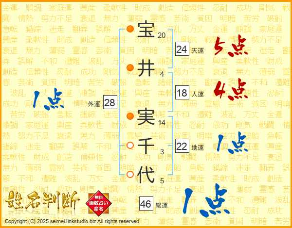 宝(20画)井(4画) 実(14画)千(3画)代(5画)