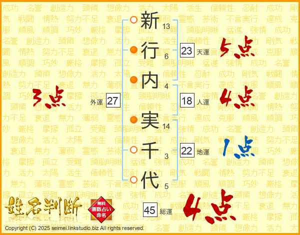 新(13画)行(6画)内(4画) 実(14画)千(3画)代(5画)