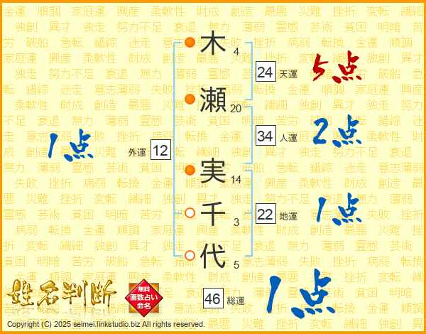 木(4画)瀬(20画) 実(14画)千(3画)代(5画)
