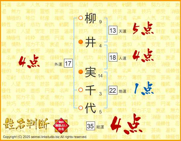 柳(9画)井(4画) 実(14画)千(3画)代(5画)