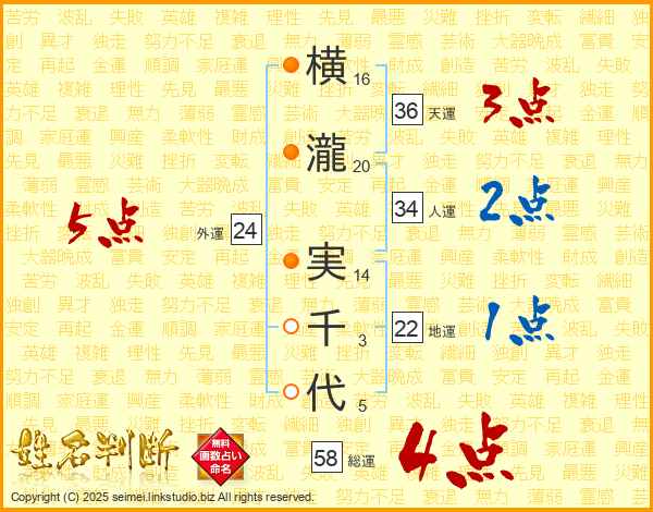 横(16画)瀧(20画) 実(14画)千(3画)代(5画)