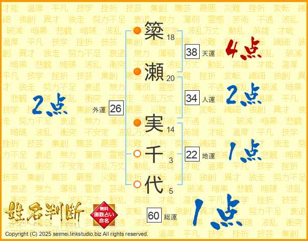 簗(18画)瀬(20画) 実(14画)千(3画)代(5画)