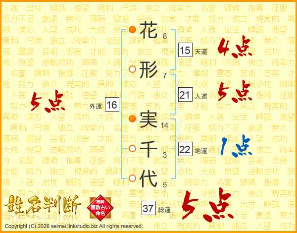 花(8画)形(7画) 実(14画)千(3画)代(5画)