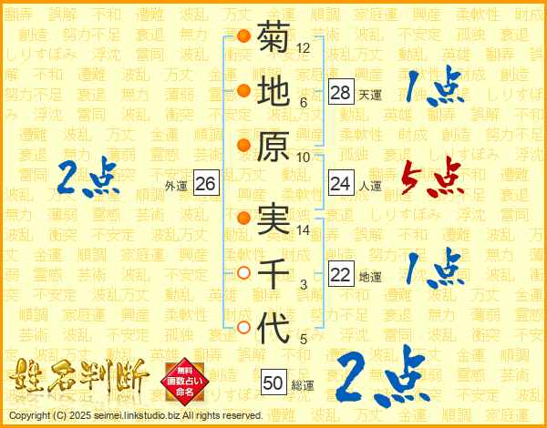 菊(12画)地(6画)原(10画) 実(14画)千(3画)代(5画)