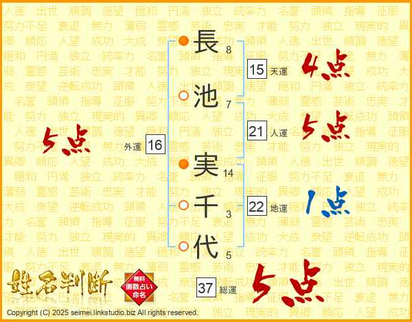 長(8画)池(7画) 実(14画)千(3画)代(5画)