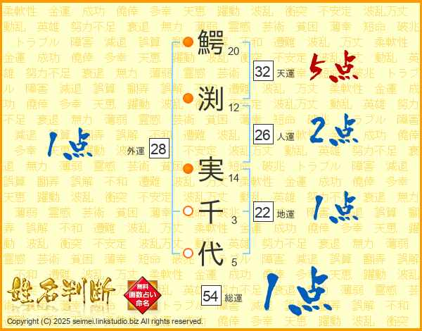 鰐(20画)渕(12画) 実(14画)千(3画)代(5画)