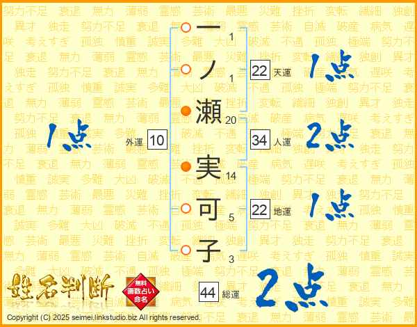 一(1画)ノ(1画)瀬(20画) 実(14画)可(5画)子(3画)