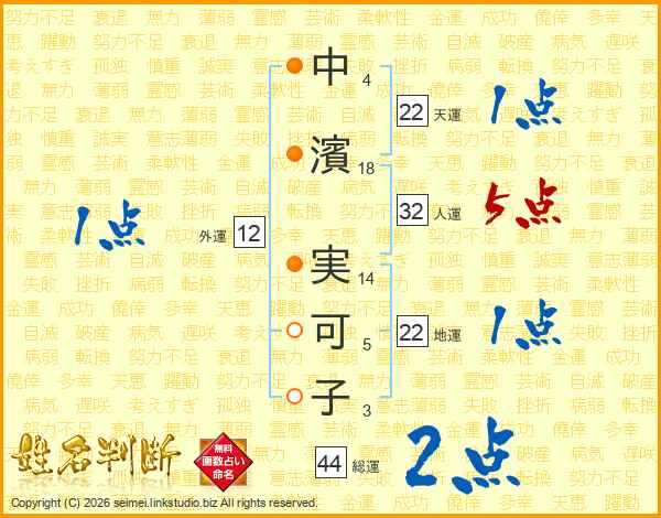 中(4画)濱(18画) 実(14画)可(5画)子(3画)
