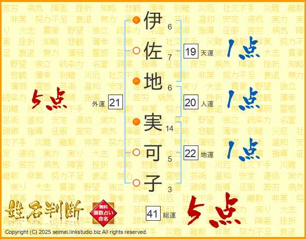 伊(6画)佐(7画)地(6画) 実(14画)可(5画)子(3画)
