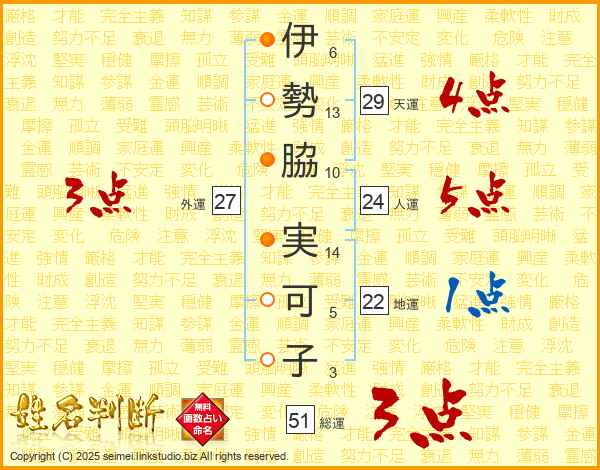 伊(6画)勢(13画)脇(10画) 実(14画)可(5画)子(3画)