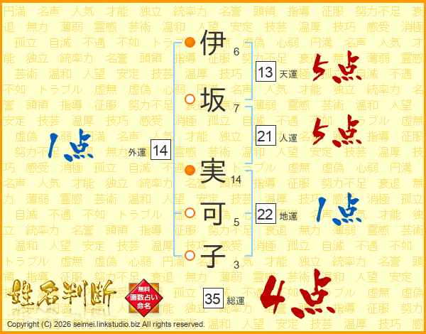 伊(6画)坂(7画) 実(14画)可(5画)子(3画)