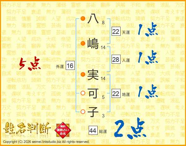 八(8画)嶋(14画) 実(14画)可(5画)子(3画)