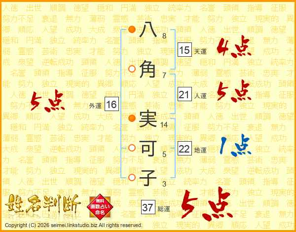 八(8画)角(7画) 実(14画)可(5画)子(3画)