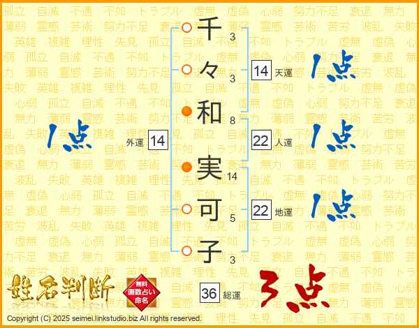 千(3画)々(3画)和(8画) 実(14画)可(5画)子(3画)