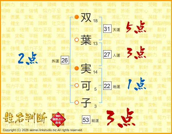 双(18画)葉(13画) 実(14画)可(5画)子(3画)