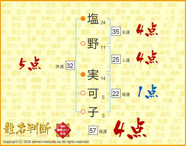 塩(24画)野(11画) 実(14画)可(5画)子(3画)