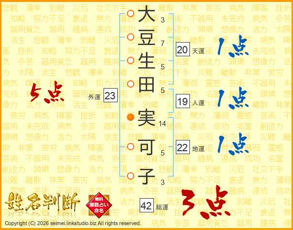 大(3画)豆(7画)生(5画)田(5画) 実(14画)可(5画)子(3画)