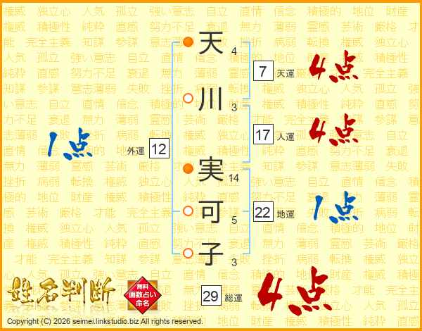 天(4画)川(3画) 実(14画)可(5画)子(3画)