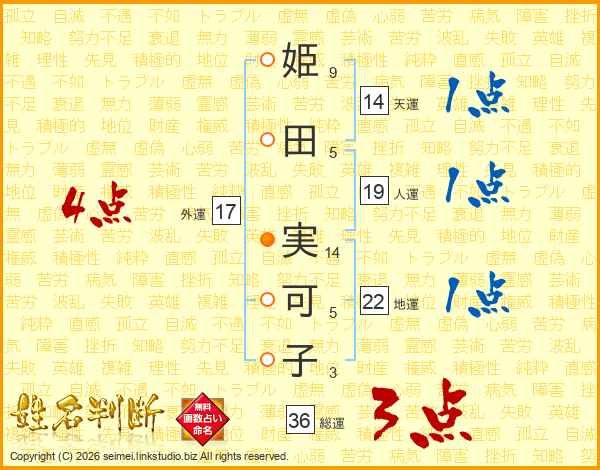 姫(9画)田(5画) 実(14画)可(5画)子(3画)