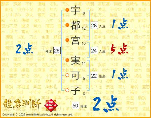 宇(6画)都(12画)宮(10画) 実(14画)可(5画)子(3画)
