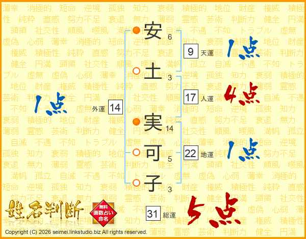 安(6画)土(3画) 実(14画)可(5画)子(3画)