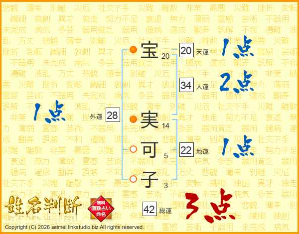 宝(20画) 実(14画)可(5画)子(3画)