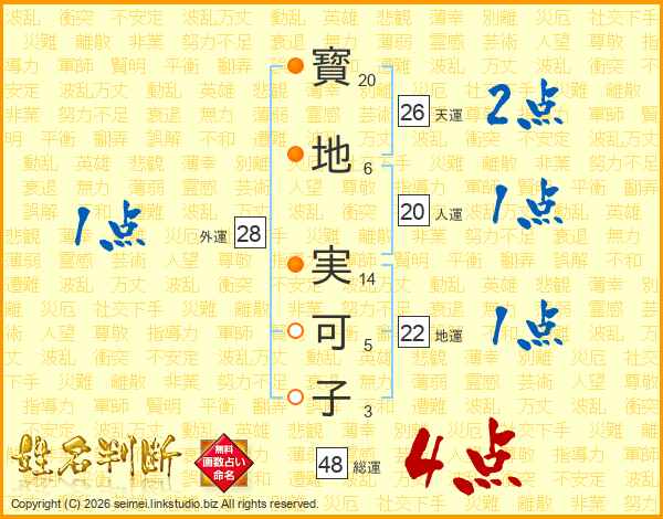 寳(20画)地(6画) 実(14画)可(5画)子(3画)