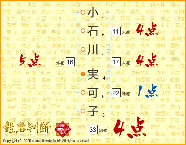 小(3画)石(5画)川(3画) 実(14画)可(5画)子(3画)
