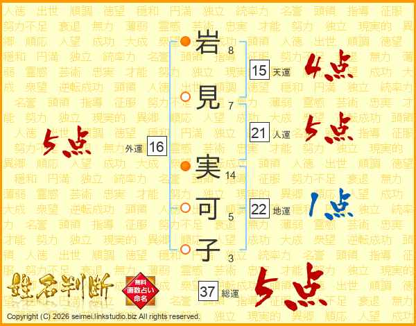 岩(8画)見(7画) 実(14画)可(5画)子(3画)