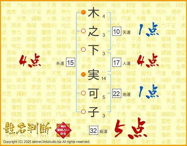 木(4画)之(3画)下(3画) 実(14画)可(5画)子(3画)