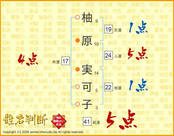 柚(9画)原(10画) 実(14画)可(5画)子(3画)
