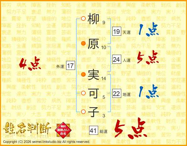柳(9画)原(10画) 実(14画)可(5画)子(3画)