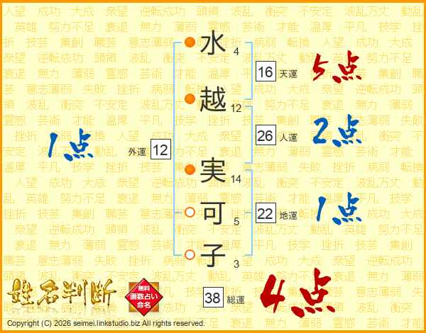 水(4画)越(12画) 実(14画)可(5画)子(3画)
