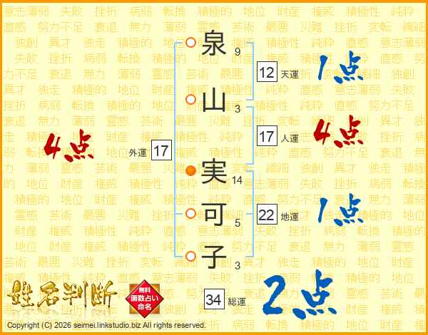 泉(9画)山(3画) 実(14画)可(5画)子(3画)