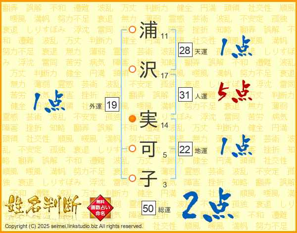 浦(11画)沢(17画) 実(14画)可(5画)子(3画)