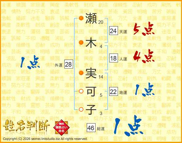 瀬(20画)木(4画) 実(14画)可(5画)子(3画)